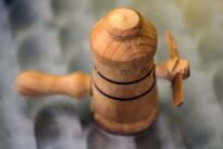 Objeto de madeira em fomato que lembra uma rolha. O objeto tem duas listras gravadas em seu centro e é atravessado por uma madeira de formato cilíndrico com uma espécie de hélice em uma das extremidades.