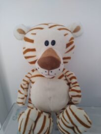 Boneco tipo pelúcia no formato de um tigre colorido em tons de amarelo claro e amarelo queimado nas suas listras. Possui olhos pretos bordados e um nariz marrom. Está sentado.