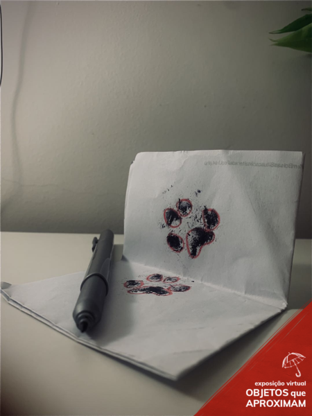 Papel branco com a marcação por carimbo de uma pata de cachorro. Possui duas marcações.