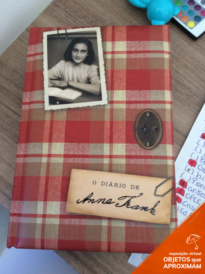 Livro com capa dura colorida com detalhes quadriculados nas cores vermelha e bege, possui uma foto em preto e branco de uma menina, um detalhe em forma de fechadura e um tipo de bilhete em papel ja amarelado escrito o nome do livro "O DIÁRIO DE Anne Frank".