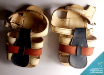 Par de sandálias de couro costurada, colorida com tiras na cor bege, marrom e preto.