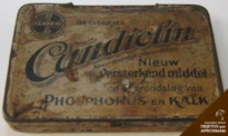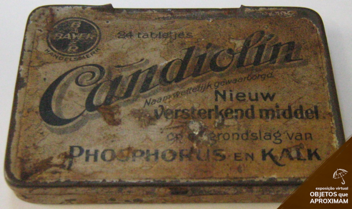 Caixa de fósforo de metal na cor amarela com o símbolo da marca escrita em preto no canto superior esquerdo "BAYER" e no centro "Cundiolin".