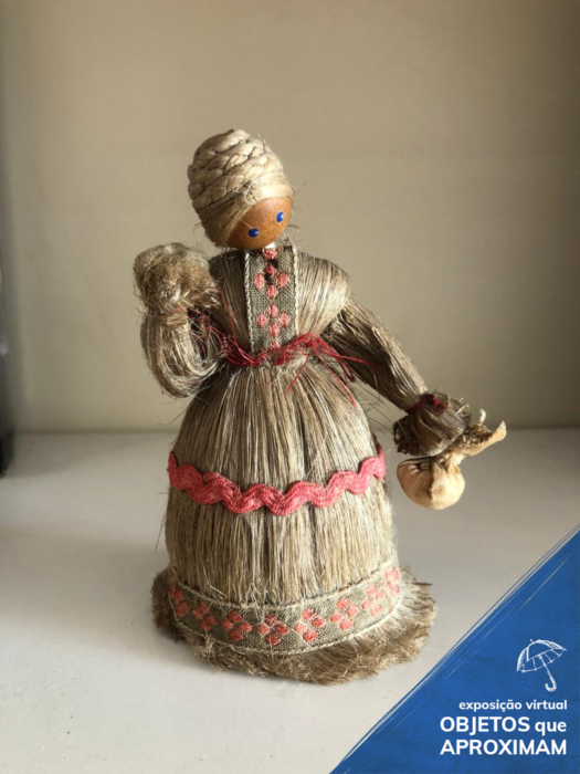 Boneca tipo de palha, colorida com olhos azuis. Possui detalhes no vestido comprido na cor rosa.