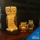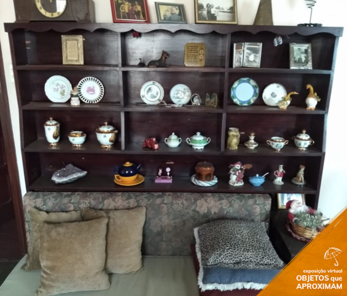 Conjunto composto por uma estante de madeira com um sofá embutido. A estante possui dez divisões, contendo um relógio de corda de madeira, sete porta retratos, um álbum de fotos, seis pratos decorativos, oito estatuetas em forma de animais, uma pedra cristalina roxa (ametista), quatro bules e quatro açucareiros. Possui seis almofadas no sofá e um papai noel.
