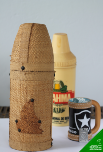 Conjunto composto por um porta latinha com o brasão do time do Botafogo e dois porta-garrafa de isopor, sendo um com uma cobertura de tecelagem e o outro em isopor com o brasão da marca de cerveja "BRAHMA".