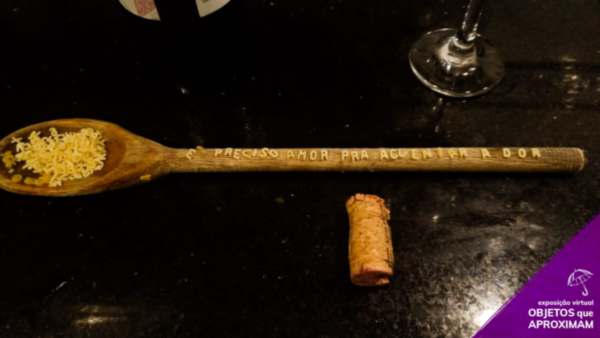 Colher de pau, feita em madeira. No cabo da colher está escrito em letras de sopa de letrinhas a seguinte frase: "É preciso amar para aguentar a dor".