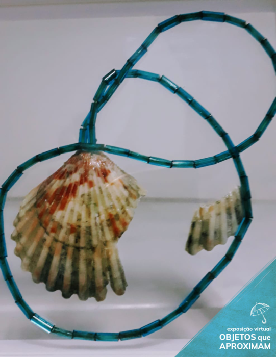 Colar feito com miçangas na cor azul e uma concha branca quebrada na ponta esquerda com detalhes na cor salmão como pingente.