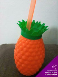 Jarra de plástico em formato de abacaxi laranja com o topo verde e um canudo laranja translucido.