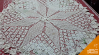 Toalha de mesa feita em crochê com detalhes de uma estrela de 8 pontas na cor branca.