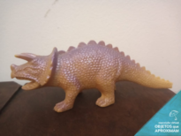 Boneco de plástico, no formato de um dinossauro da espécie Tricerapros. Colorido em tons de marro claro e bege.