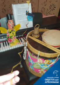 Conjunto composto por um Piano preto com as teclas brancas e pretas, com detalhes em vermelho, colagem de boizinho na cor azul, fantoche do Homem da Meia-Noite com uma roupa amarela com estampa florida e utilizando uma cartola preta, alfaia com uma pintura de floral, baquetas de madeira, pandeiro com uma listra na cor vermelha, caxixi e um fio colorido em diversas cores.