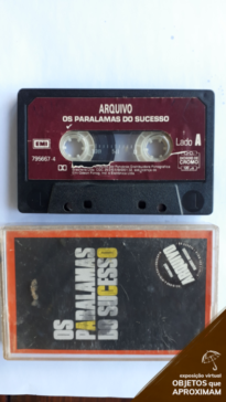 Conjunto fita cassete para gravação de áudio mais capa. Fita com a caixa preta e o centro com adesivo em vermelho e detalhes escritos em branco. Capa com fundo preto escrito "OS PARALAMAS DO SUCESSO" com letras brancas e amarelas no centro e um adesivo circular no fundo esquerdo escrito "ARQUIVO".