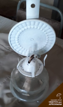 Este lampião é muito antigo de 1955, traz lembranças de infância, quando criança nos tempos de escola, usava para iluminar as horas que passava fazendo atividades. Colocava querosene na parte inferior e na superior tinha um vidro protetor quando ascendia o estopim, o vidro servia de proteção para que o vento não apagasse a luz, ou perigo de cair e pegar fogo na casa ou no cabelo por ficar próximo do cabelo para enxergar bem as atividades. Uso esta peça hoje para decorar a casa, e recordar de momentos que vivi numa época que nem existia energia elétrica. .(Atividades realizadas no projeto "Resgate de memórias em tempos de pandemia" proposto pela professora de artes visuais "EDNA RODRIGUES" com alunas do "Departamento de cultura de Herval d'Oest).