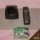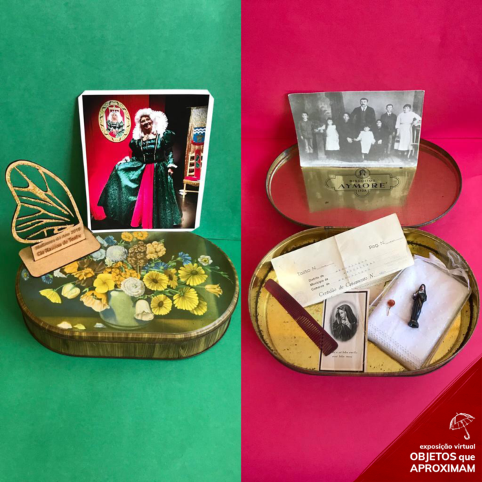 Conjunto composto por uma foto colorida de uma jovem usando um vestido longo verde com um listra vermelha, uma estatueta de madeira de com o formato de uma asa de uma borboleta e uma caixa tipo lata na cor dourada com uma estampa florida na tampa. No interior da caixa se encontram um pente fino, uma pequena estatueta religiosa e uma foto preto e branco.