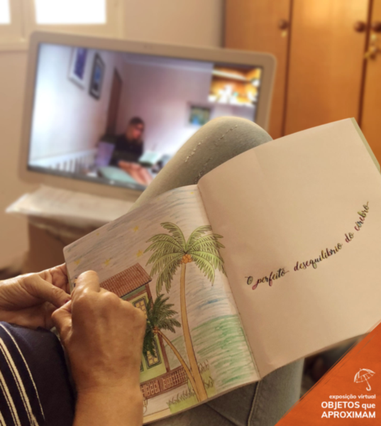 Livro em branco sendo desenhado uma casa com vista para o mar e um coqueira na noite, coloridos com a frase escrita na outra página em letra cursiva "O perfeito desequilíbrio do cérebro".