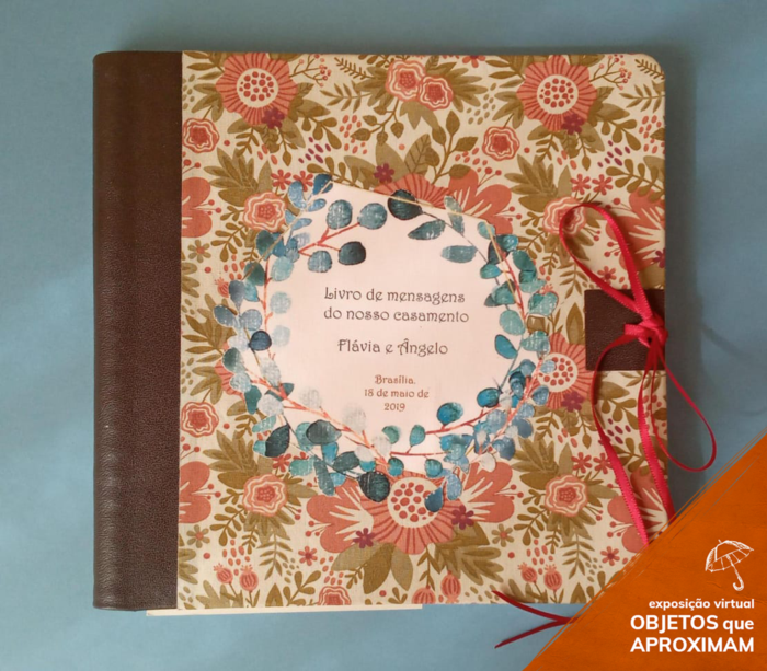 Livro com capa dura colorida com detalhes em floral nas cores azul, verde, rosa e vermelho e no centro esta escrito em preto sobre um fundo branco "Livro de mensagens do nosso Casamento", "Flávio e Ângela" e "Brasília, 18 de maio de 2019". Possui uma fechadura por onde se passa um laço vermelho para amarrar e deixar o livro fechado.