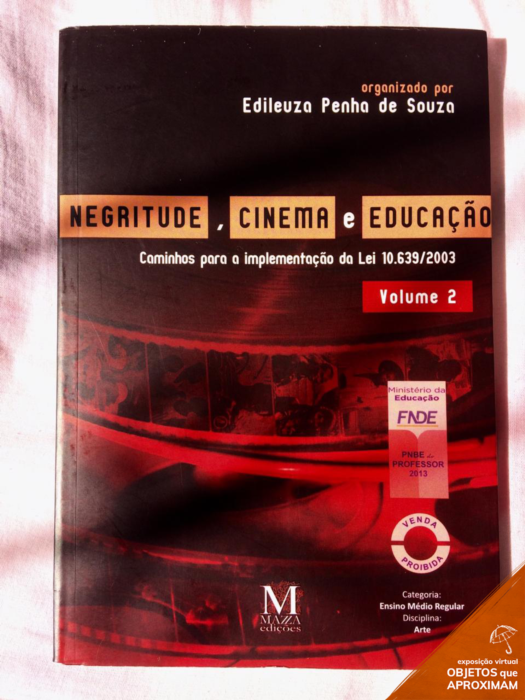 Livro capa mole costurado. Possu na capa a imagem de um rolo de filme aberto de um lado para o outro da capa e colorida em tons de preto, vermelho, branco e amarelo. No centro da capa, em letras pretas com uma marcação em amarela, segue o seguinte titulo escrito "NEGRITUDE, CINEMA e EDUCAÇÃO".