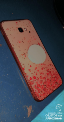 Conjunto composto por um aparelho celular tipo Smartphone na cor branca. Possui uma câmera na parte traseira e flash, uma capa de silicone rosa translucida com detalhes em corações vermelhos e um Popsocket branco no centro.