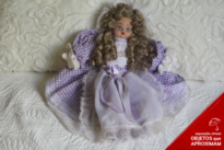 Boneca tipo de louça, colorida com as sobrancelhas pretas, olhos azuis e boca vermelha pintados. Possui cabelo longo loiro e esta vestindo um vestido em detalhes xadrez roxo e branco.