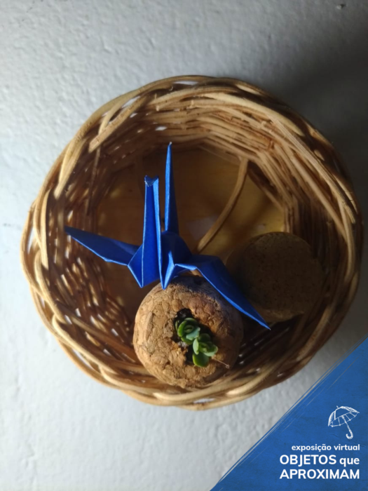Conjunto composto por uma cesta de palha contendo um Tsuru Azul - origami de um pássaro - e duas rolhas, sendo que uma delas está nascendo algum tipo de vegetação.