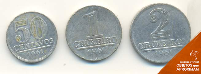 Conjunto composto por três moedas cunhadas em alumínio todas dastas do ano de 1961. Da esquerda para direita temos os seguintes valores escritos "CINQUENTA CENTAVOS", "UM CRUZEIRO" e "DOIS CRUZEIROS".