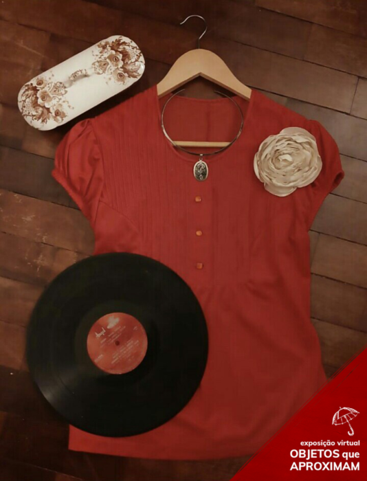Conjunto composto por um porta pentes de porcelana branco com detalhes em vermelho, um pingente e uma blusa de abotoar com mangas curtas na cor vermelha com uma flor de cetim na cor champagne no lado superior esquerdo.
