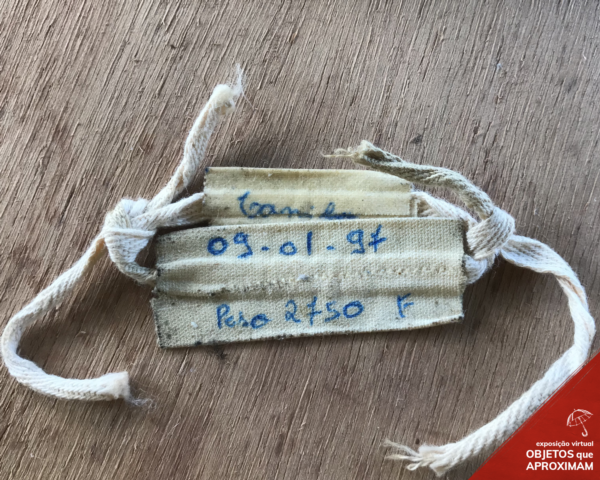 Pulseira feita de barbante e fita médica branca. Possui as seguintes anotações feitas a mão em caneta azul em letra cursiva: no topo "Camila", no centro "00-01-97" e embaixo "Peso 2750 F".
