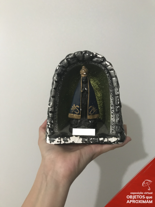 Era 2012, Santuário de Nossa Senhora Aparecida, SP. Minha avó, Creuza - in memoriam - era devota de Nossa Senhora Aparecida. Ela fez uma promessa de que anualmente iria ao Santuário pedindo em troca que a Síndrome de Duchene, que ela tinha, não avançasse, tivesse saúde e felicidade. Então fomos ao Santuário. Eu por querer conhecer, além de respeitar muito essa Santa e ela por sua devoção, junto de nós estava minha mãe (Maria das Neves) e minha tia avó (Auria Belém). Eu ia me mudar definitivamente para Pelotas em meses, pois começaria minhas aulas em meses. Minha avó sabendo disso foi ao Santuário e fez questão de comprar e me dar essa imagem da Santa. Lembro dela me dizer que era para me proteger e me amparar na minha nova vida. Eu olho essa imagem e vejo minha avó, saudade eterna! Não tenho dúvida de que ela esta junta de Nossa Senhora Aparecida nesse momento.