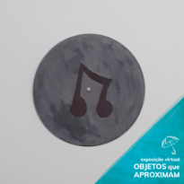 Disco de vinil pintado com o fundo cinza e com pequenos toques de preto, possuindo no centro um símbolo duplo musical.
