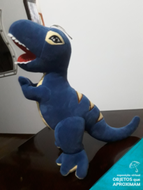 Boneco tipo pelúcia na forma de do dinossauro Tiranossauro Rex. Colorido com o corpo na cor azul e detalhes na cor amarela. Esta de pé com a sua boa aberta.