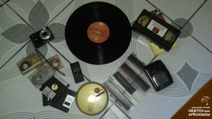 1 disco de Vinil. 1 Walkman, 1 discman, 1 câmera fotográfica digital, 4 negativos de fotografias. 3 disquetes. 1 MP3 3 fitas para rádio 1 fita para vídeo cassete. São objetos que fizeram parte da minha infância e adolescência, todos com valor sentimental familiar e também gerava muita briga para poder usar alguns devido ser o único em casa, tinha que esperar a vez para poder usa- los. Com o tempo não se teve mais uso, fazendo com que os donos descartassem os mesmos. Com isso guardei todos, e hoje eles são de grande utilização na minha profissão. Sou professora de Artes Visuais, esses objetos para meus alunos despertam muita curiosidades e gera dúvidas de como esses objetos eram utilizados sem a internet.