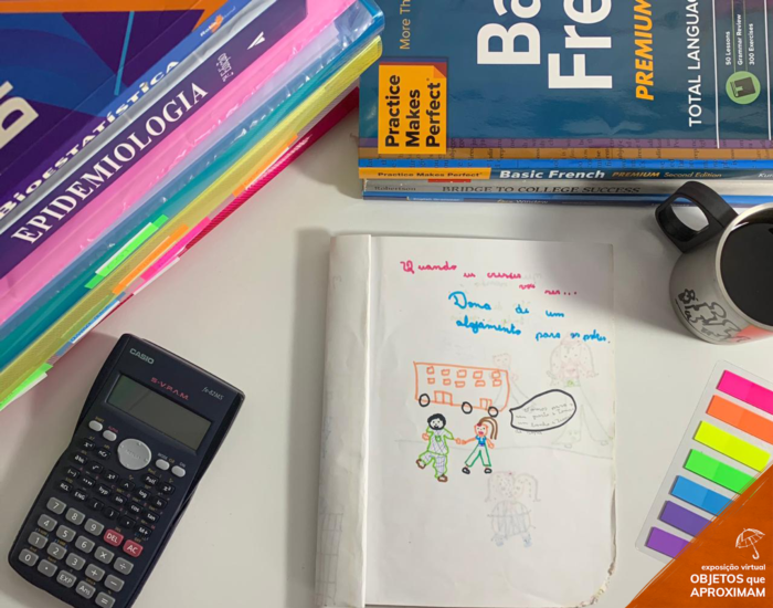(Re)encontrei este desenho durante a Quarentena. Ele fez eu viajar para o ano de 2001, quando eu tinha 7 ou 8 anos e estava na segunda série.Naquele tempo, embora pequena, eu já tinha uma certeza: queria me sentir realmente útil na nossa sociedade e a melhor maneira para isso era ajudando quem precisava.Este desenho representa essa vontade: um morador de rua e eu estamos saindo de uma "Kombi" e indo em direção ao meu “alojamento” para pessoas pobres (agora, a melhor palavra seria em vulnerabilidade social, mas na época, o termo “pobre” representava pra mim todos que precisavam da minha ajuda). Lá, este homem tomaria um bom banho, receberia roupas limpas e poderia se alimentar e descansar. É uma ideia simplista de como resolver esse problema, não é mesmo? Mas, talvez, o recado que a Gabriela da 2ª série quisesse passar era: Gabriela de 2020, não desiste do teu sonho de “se sentir realmente útil na sociedade. Não me decepciona.” É, esse desenho faz eu entender o porquê das minhas escolhas: ser fisioterapeuta e futura epidemiologista. Talvez eu não consiga criar o tão sonhado “alojamento”, mas, através da minha profissão, estou aprendendo e buscando instrumentos para continuar na luta contra as iniquidades existentes na nossa sociedade. E assim seguirei, por amor às causas - chamadas de - perdidas!