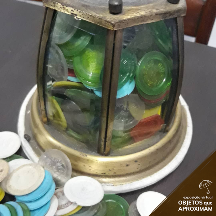 Porta Fixas de ônibus dos anos 50. Possui 4 paredes de vidro transparente com divisórias em metal dourado (com coloração desbotada pela ação do tempo) e uma tampa de em metal com uma pequena entrada para inserir as fixas. No inteiro se encontra diversos tipos de fixas de transporte da época.