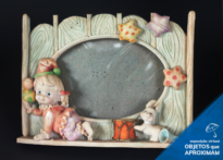 Porta-retrato de cerâmica no formato retangular com detalhes representando uma cerca de madeira, almofadas em forma de estrela, um coelho branco, um tambor laranja e uma de pijama engatinhando. Possui um espaço oval no centro para foto.