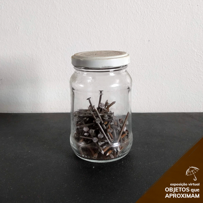 Os pregos, hoje guardados em um pequeno pote de vidro, já estavam oxidados antes de serem protegidos do mundo. Comprei um saco de pregos em ma ferragem quando fui montar uma exposição. Alguns foram usados para pregar fotografias, outros foram colocados próximo ao chão, soltos em cima de um tijolo que pertencia a uma casa dos anos 40 e à brita que representava o novo revestimento do terreno que um dia abrigou uma pequena fábrica no bairro Floresta, em Porto Alegre, objeto da observação que veio a ser exposição. Os pregos nas paredes da galeria não aparentemente não sofreram com a ação o tempo, porém, os que estavam soltos, desempregados, oxidaram. Envelheceram. Enferrujaram. Hoje, os vendo na pequena redoma que os protege do esquecimento, do tempo, sou provocada a lembrar que a cada segundo em que pesquiso, atuo, produzo e oxido vagarosamente, construo, nas cidades, em outros corpos, possibilidades de empregar algo na memória.