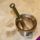 Pequeno relicário feito em cobre com uma pedra ágata de fogo no centro da tampa.