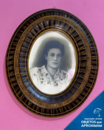 Retrato em preto e branco com uma moldura oval em cerâmica com detalhes de riscos pretos e bronze intercalados. Na foto, uma jovem mulher com cabelos compridos vestindo uma camisa branca com detalhe em floridos.