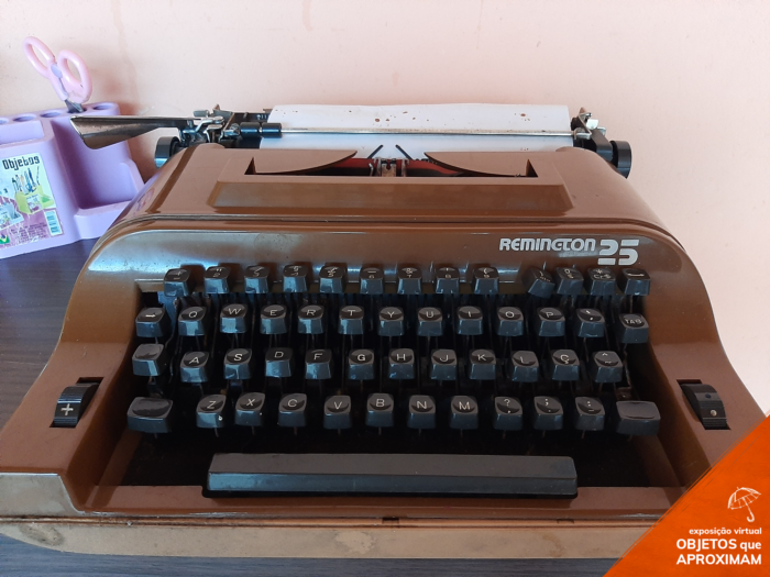É difícil precisar com exatidão a data do invenção da máquina de escrever, segundo estudiosos, se deu entre 1719 a 1800. Desde sempre a comunicação entre os homens é algo primordial, seja ela verbal ou não, através de linguagem corporal ou gestos, certo é que sempre tivemos a necessidade de nos comunicarmos. E através da comunicação formamos opinião, expressamos sentimentos, fazemos história. O artefato da foto chegou pra mim em meados de 1989, era uma criança ávida por leituras, gostava muito de escrever em caderninhos e diários, colecionar papeis de carta e até embalagens de doces diferentes, realizava colagens e desenhos destacando pensamentos do dia em meus cadernos. Meu pai, homem simples, com pouco estudo, porém sabido de que através dos estudos é que se pode mudar muitas coisas, sempre me incentivou a estudar, ele dizia "um dia você será professora!". Apesar de meus pais não terem tido as oportunidades de estudo que tive, as estantes sempre tinham livros, minha mãe sempre estava parcelando enciclopédias que eram vendidas de porta em porta pra garantir que fôssemos jovens pesquisadores. Daí então meu pai me presenteou com essa máquina, a 30 anos atrás, utilizei por muito tempo, escrevi cartas pra família toda, e para minhas amigas, era forte meio de comunicação, insistia pra minha mãe enviar algumas cartas pelo correio mesmo podendo entregá-las pessoalmente só pra eu e minhas amigas termos esse prazer de receber uma carta pelo correio...quando não tinha o que escrever, pegava livros de poemas para copiá-los na folha sulfite, me sentia tão importante! Fiz muitos trabalhos escolares nela, e me lembro de meu pai com sua xícara de café fumaçando de quente, encostado na parede entre o corredor e a sala me observando digitar. E meus irmãos em cima de mim curiosos por saber como usar a tal máquina, algumas vezes compartilhava a tarefa com minha irmã mais nova, eu digitava e ela empurrava a alavanca ao final da folha ou girava a pequena manivela (se posso chamar assim) pra subir a folha e continuar a escrita. Fui muitas vezes na avenida próxima de casa para colocar as cartas na caixa de correio, aquelas amarelas com emblema destacado em azul e branco que o carteiro passava pra recolher depois. Tenho ela comigo, já sem uso, pois foi substituída a tempos pelo computador, mas ela é como um amuleto pra mim e tenho tanto orgulho de tê-la, sou professora e sempre que falo sobre inventos e passagem de tempo faço questão de levá-la a escola para exposição junto com outros objetos que fazem parte da história da humanidade e da minha história pessoal. Ah, e meu pai tem orgulho de quando me vê utilizando o artefato para minhas aulas e de ver que ela se tornou parte da nossa história, a história da família Santos.