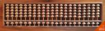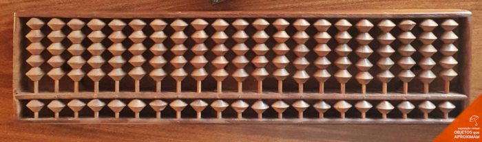 Soroban de madeira composto por uma caixa retangular de madeira com vinte e umas varetas com seis bolotas de madeira em cada podendo se mover para pode calcular.