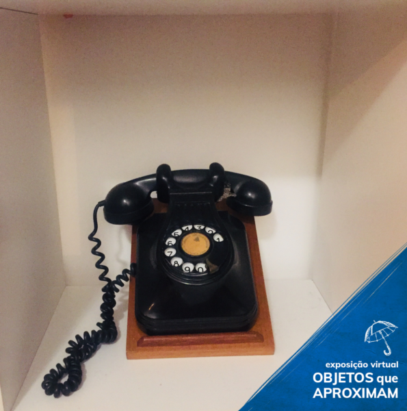Telefone tipo disco, na cor preta, com o disco preto e o fundo branco com os números de zero até nove, fio na cor preta e possui uma base de madeira."
