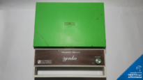 Toca-discos portátil, colorido, possui uma caixa retangular na cor verde limão, seu display frontal na cor marrom com detalhes em madeira e as bordas na cor branca com. Possui no canto esquerdo inferior um botão e as seguintes descrições escritas no display: “CALIFORNIA” no canto direito inferior, “TOCADISCO PORTATIL” no centro superior e “yenka” logo a baixo, “VOLUMEN” na parte superior do botão e “ENC” a direita do botão.