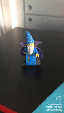Boneco articulado da marca Lego na forma de um mago. Está vestindo um chapéu pontudo, camisa e calça na cor azul com detalhes em estrelas e meia lua em amarelo, usando também uma capa roxa. Possui uma barba grisalha que cobre metade do seu rosto.