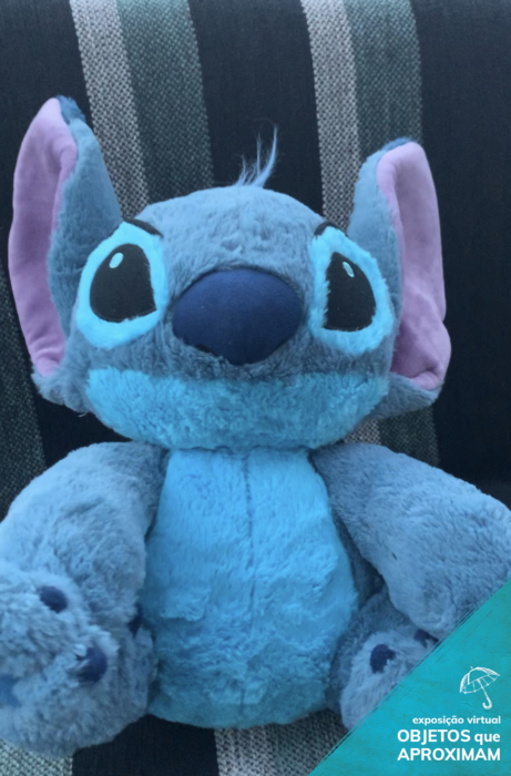 Boneco tipo pelúcia, no formato de um personagem do filme Lilo & Stitch. O stitch colorido, possui o corpo azul escuro com detalhes em azul claro, possui olhos pretos, nariz azul forte e o interior das orelhas rosadas. Está sentado.