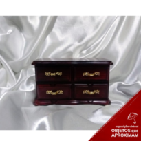 Caixa de música em formato de uma cômoda envernizada com quatro gavetas com puxadores de ferro dourados.