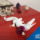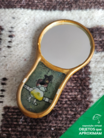 Espelho circular pequeno com um cabo largo, cor amarelo nas bordas e um fundo vender no cabo com um desenho de uma criança com um pássaro preto na cabeça, boné vermelho e uma roupa amarela.