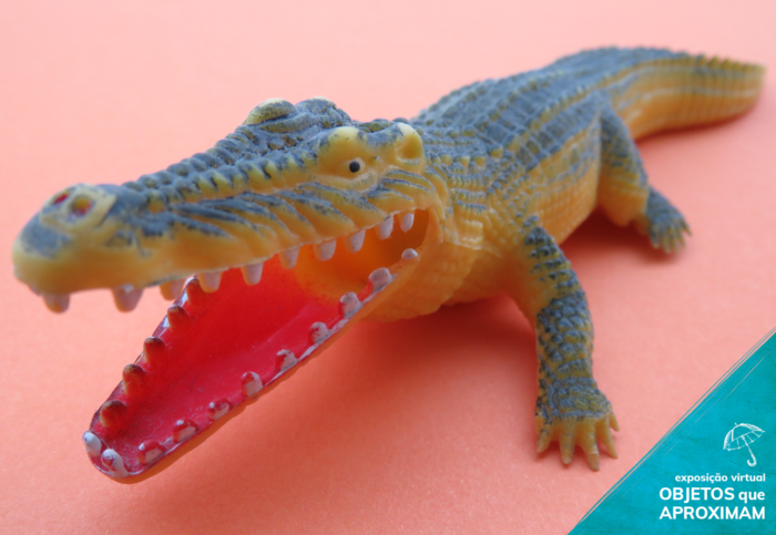 Jacaré de brinquedo feito de plástico. Colorido, com a parte de baixo na cor amarela e as suas escamas numa tonalidade de verde musgo, sua boca esta aberta e o seu interior é vermelho. Possui dois olhos, narinas e dentes.