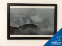 Quado emoldurado com moldura de madeira preta. Na imagem possui um vulcão de fundo e uma vegetação montanhosa e com arvores, em preto e branco.